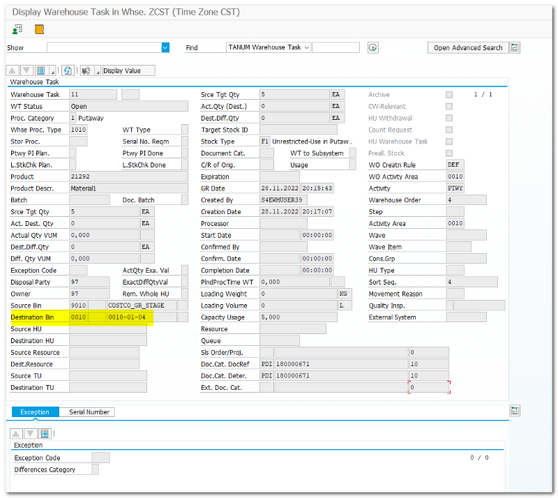 Result : Destination Storage Type (0010) got determined when Warehouse Task is confirmed