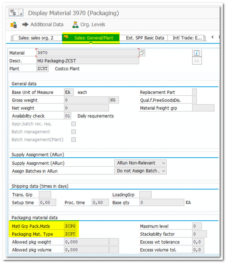 | MM01 /SCWM/MAT1 | Maintain below field value in Basic Data1 Created packaging material 3970 for Plant ZCST Created Second Packaging Material 3972(HU) Material Group: Packaging Materials (ZCPG) |