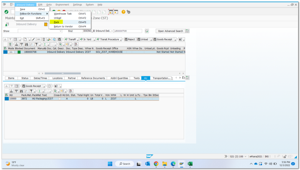 | Creased Purchase Order with Material #3970 (PO#4500100213) Created Inbound Delivery for PO #4500100213 Inbound Delivery #180000708 (HU in ERP) |