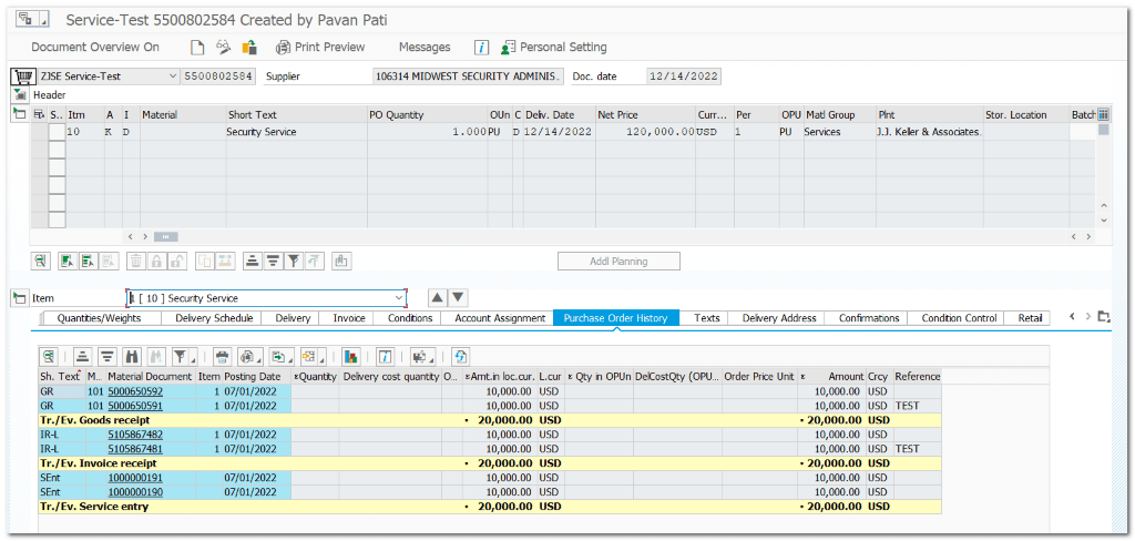 | Service Entry Sheet will get updated in PO History Material Document with 101 movement type will get updated once Service Entry Sheet entry is “Accepted” Invoice Document will get updated in PO History |