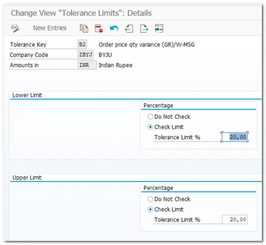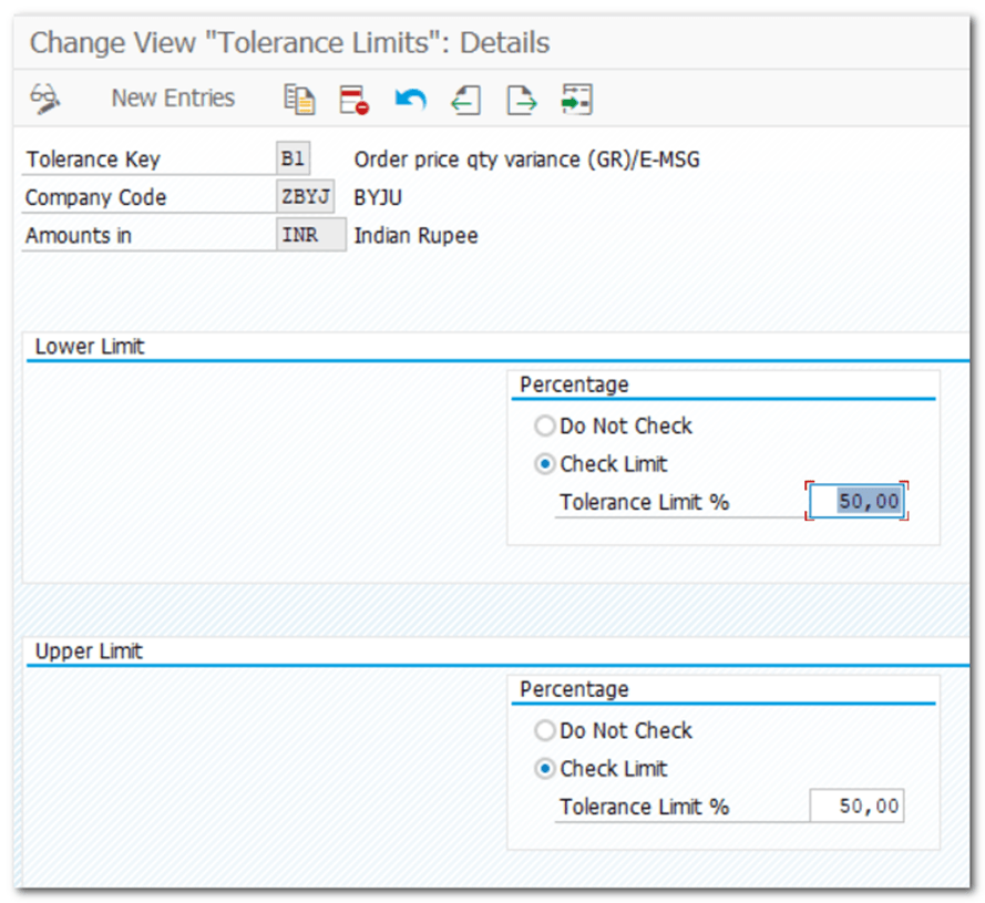 | IMG TCODE | Materials Management- Inventory Management and Physical Inventory- Goods Receipt- Set Tolerance Limits |