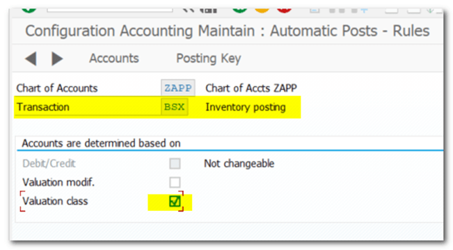 | IMG TCODE (OMSK) | Materials Management- Valuation and Account Assignment- Account Determination- Account Determination Without Wizard- Define Valuation Classes Account Category Reference Valuation Class Material Type/Account Category REference |