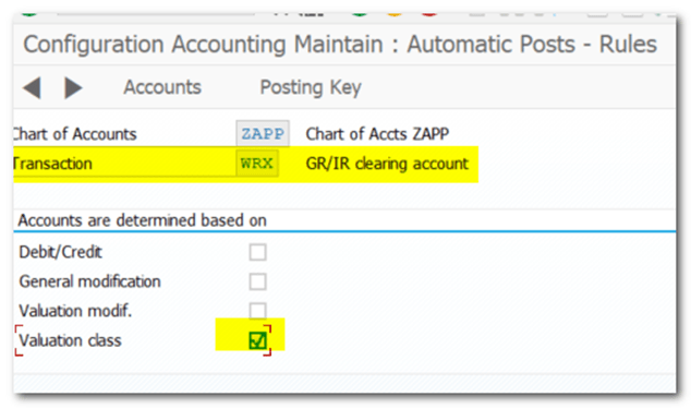 | TCODE 100504 GR/IR Clearing | Materials Management- Valuation and Account Assignment- Account Determination- Account Determination Without Wizard- Configure Automatic Postings OBYC |